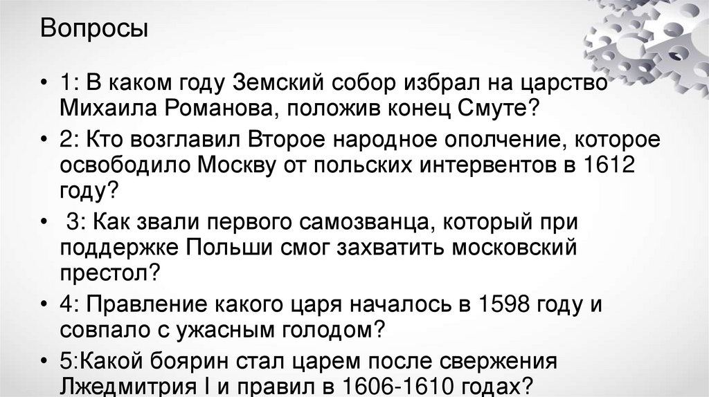 Вопросы• 1: В каком году Земский собор избрал на царство
