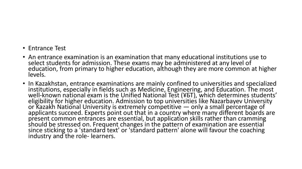 • In Kazakhstan, entrance examinations are mainly confined to universities and specialized