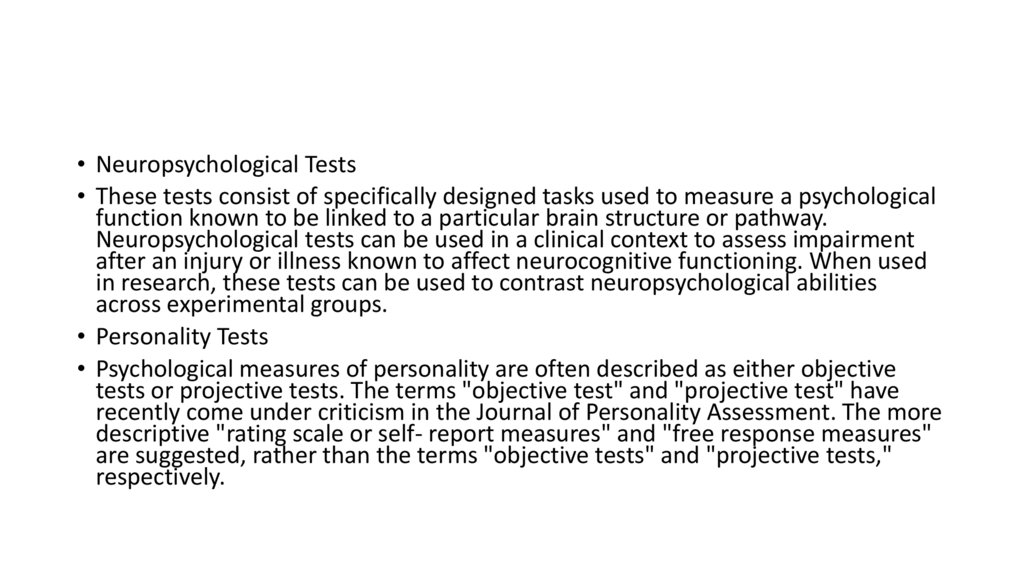 • Neuropsychological Tests• These tests consist of specifically designed tasks used to measure a psychological