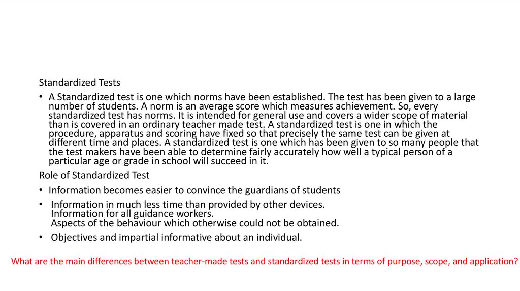 than is covered in an ordinary teacher made test. A standardized test is one in which the