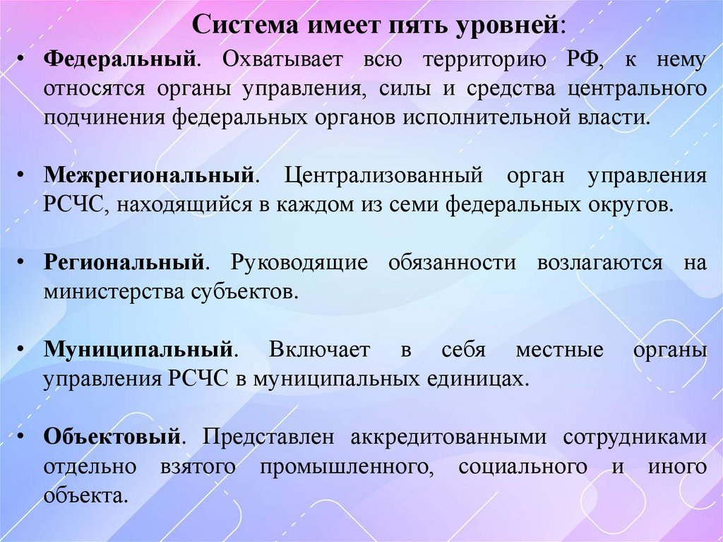 Система имеет пять уровней:• Федеральный. Охватывает всю территорию РФ, к нему