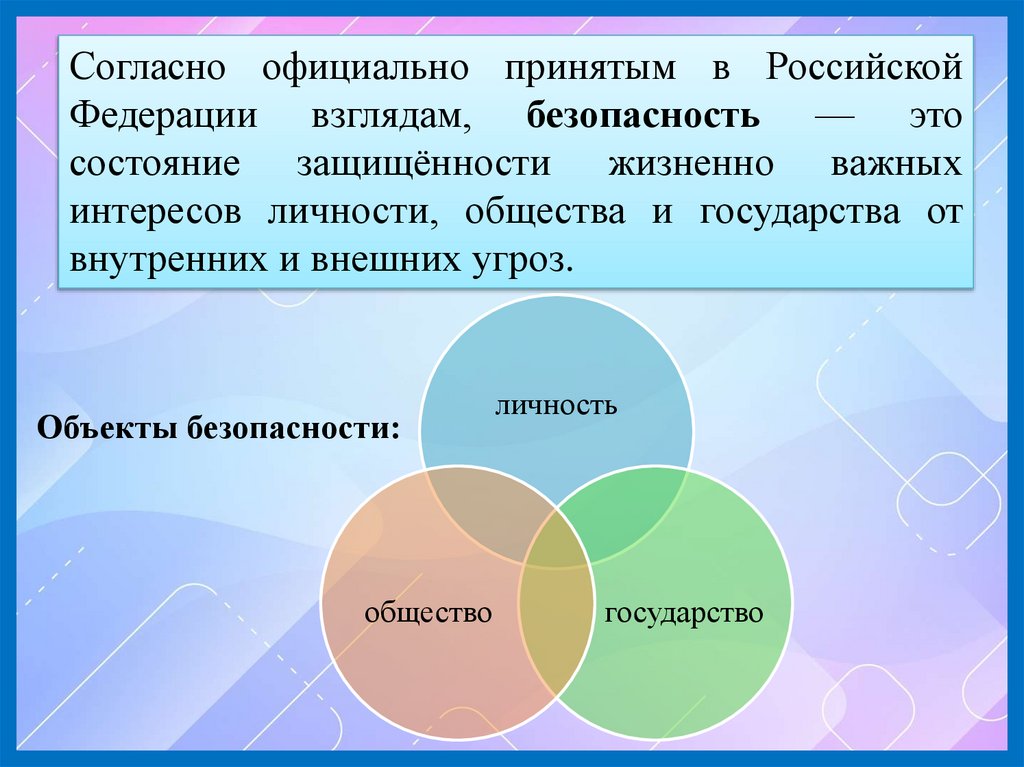 Согласно официально принятым в РоссийскойФедерации взглядам, безопасность — это