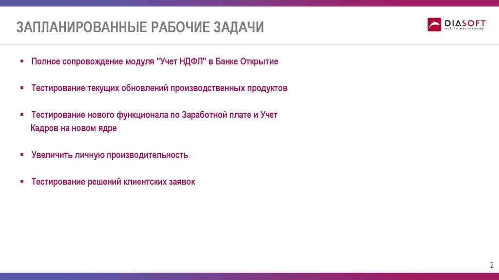 ЗАПЛАНИРОВАННЫЕ РАБОЧИЕ ЗАДАЧИПолное сопровождение модуля "Учет НДФЛ" в Банке Открытие
