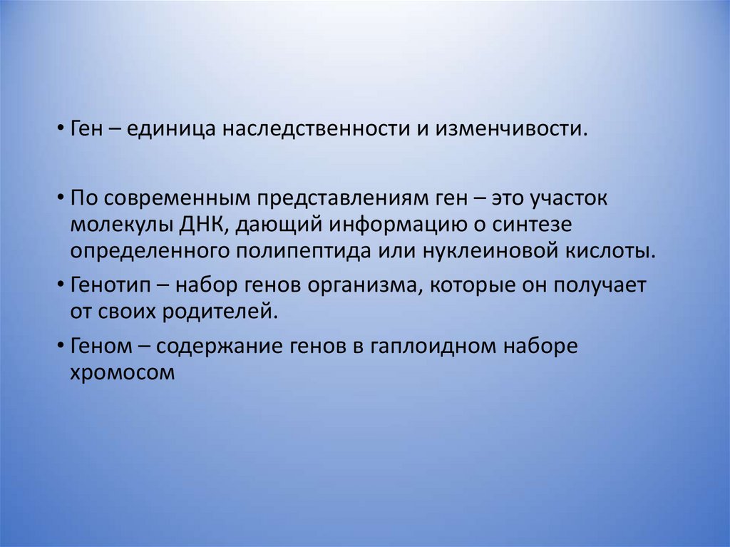 • Ген – единица наследственности и изменчивости.• По современным представлениям ген – это участок