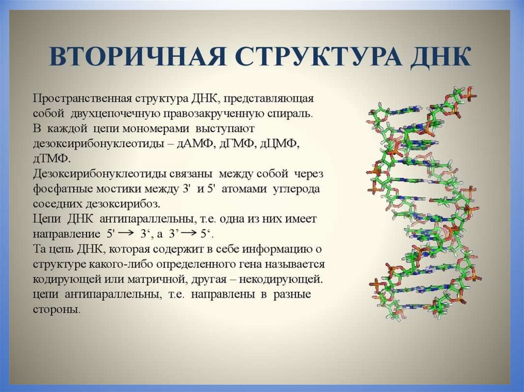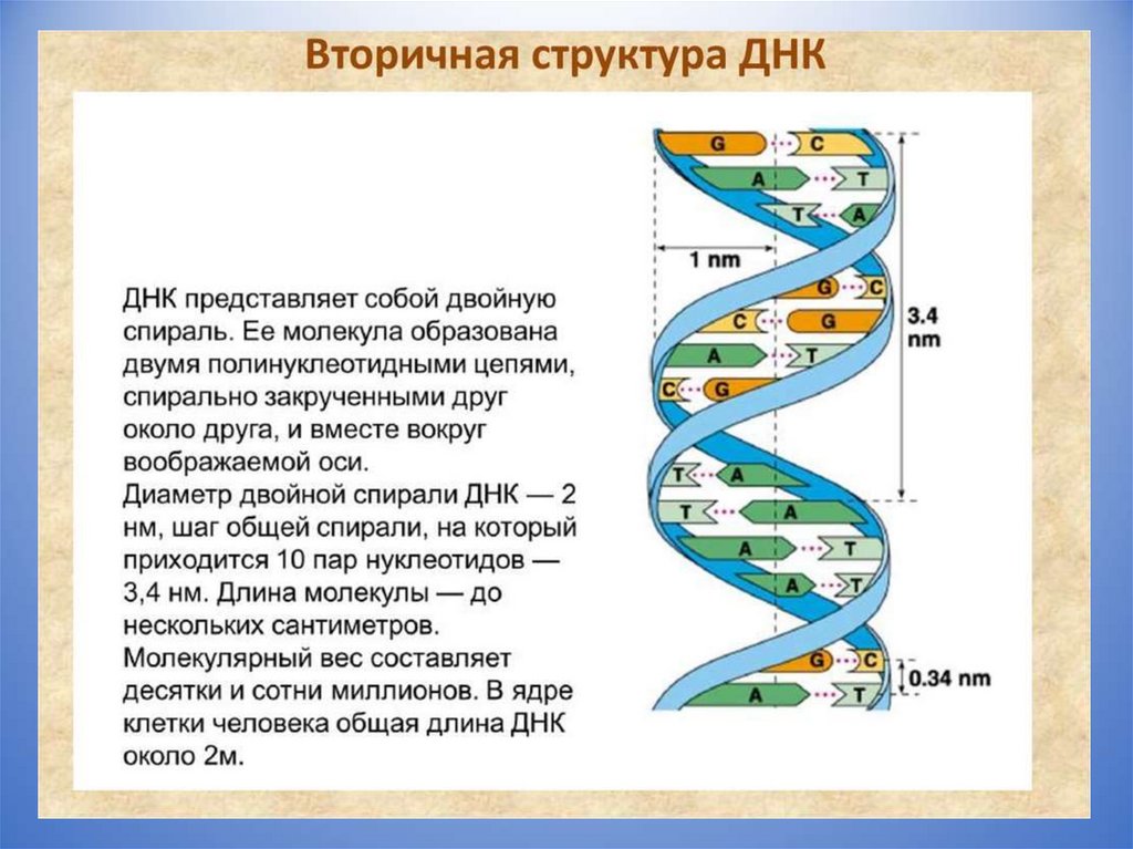 Молекула ДНК – спиральная, состоит из двух полинуклеотидныхцепей, закрученных вокруг общей оси – вторичная структура. Пары