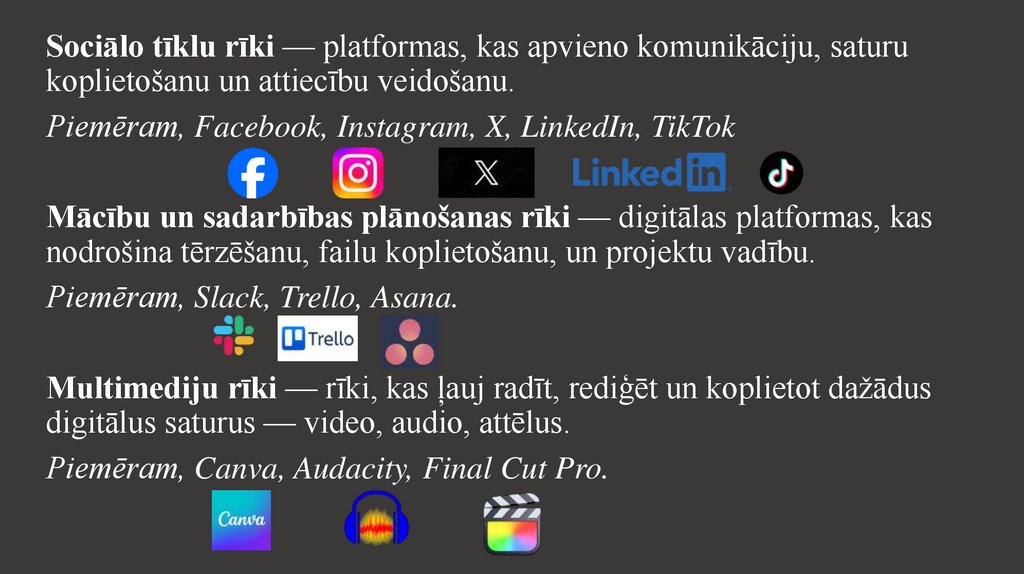 Sociālo tīklu rīki — platformas, kas apvieno komunikāciju, saturukoplietošanu un attiecību veidošanu.