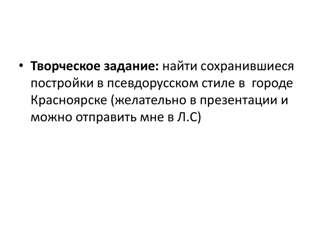 • Творческое задание: найти сохранившиесяпостройки в псевдорусском стиле в городе
