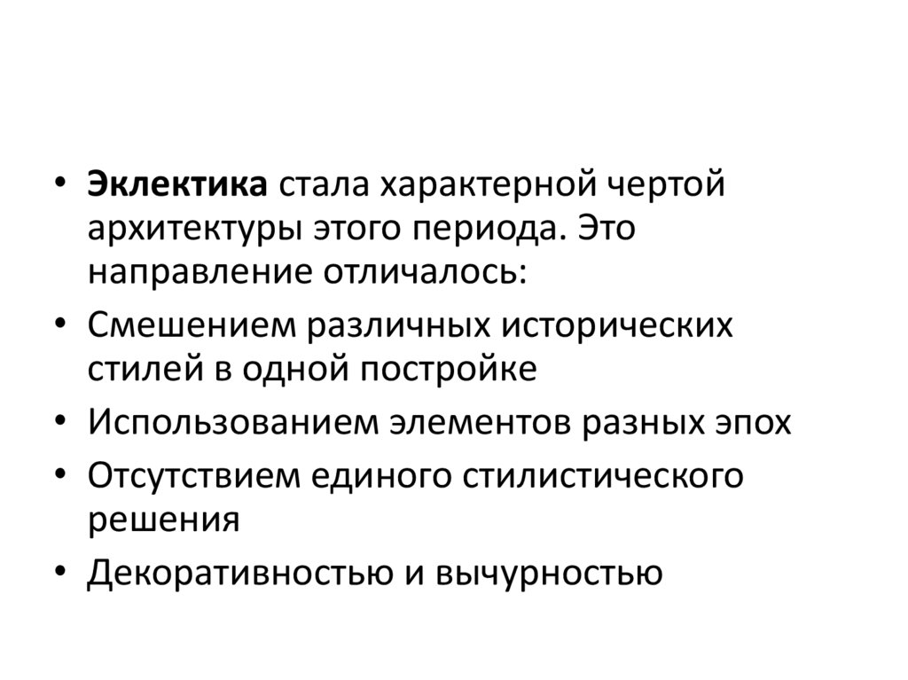 • Эклектика стала характерной чертойархитектуры этого периода. Это