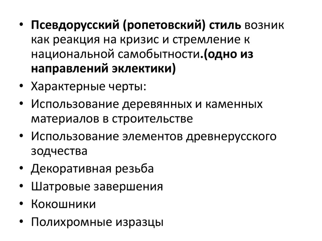• Псевдорусский (ропетовский) стиль возниккак реакция на кризис и стремление к