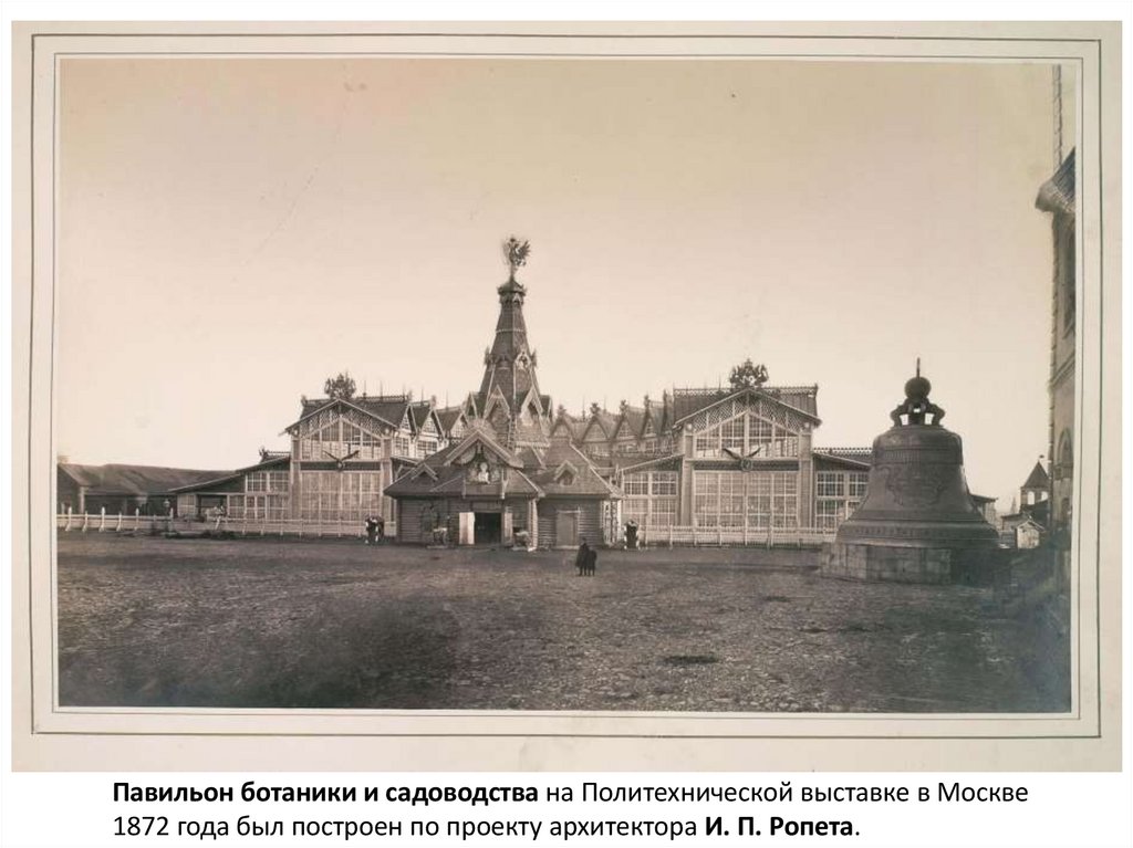 Павильон ботаники и садоводства на Политехнической выставке в Москве1872 года был построен по проекту архитектора И. П. Ропета.