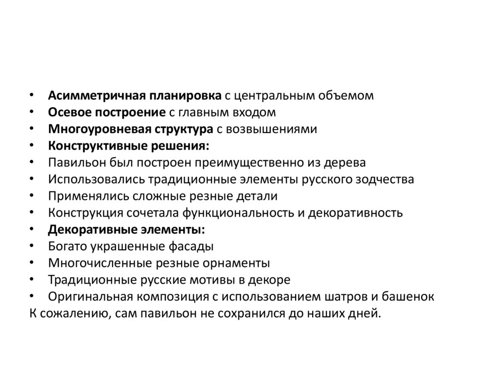 Псевдорусский стиль (неорусский стиль) проявляется в следующих чертах:
