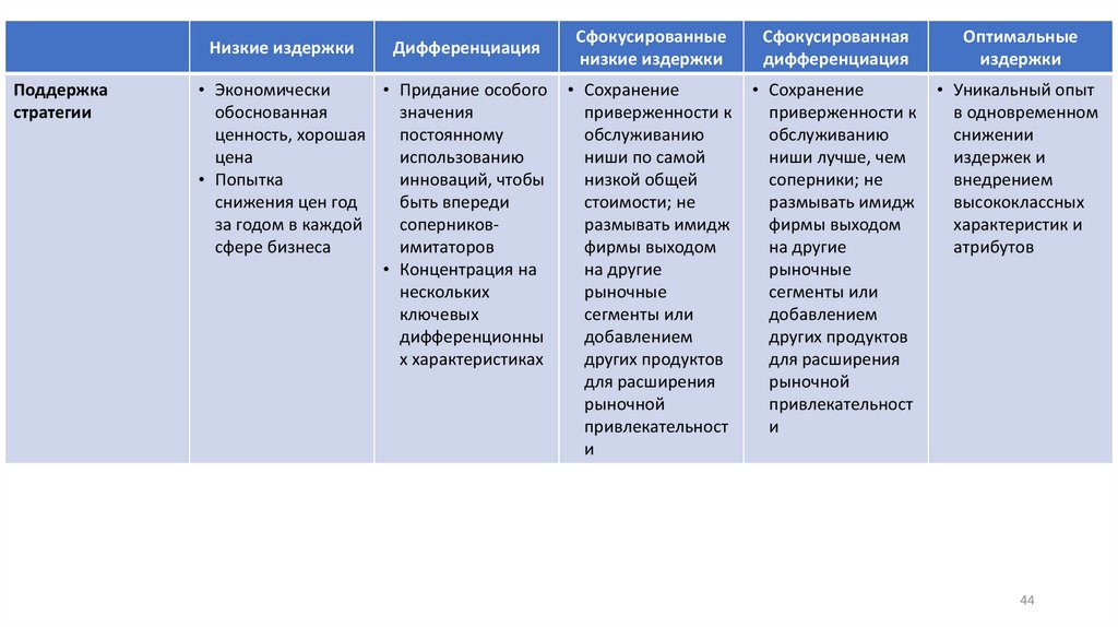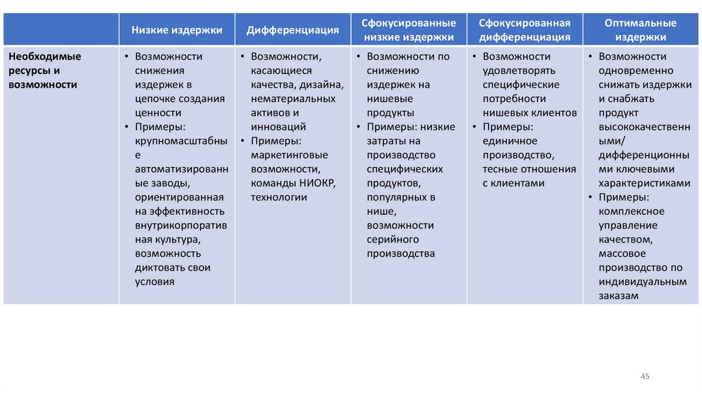 1. Стратегия низких издержек ориентируется на достижениеболее низкого, чем у соперников, уровня общих затрат на