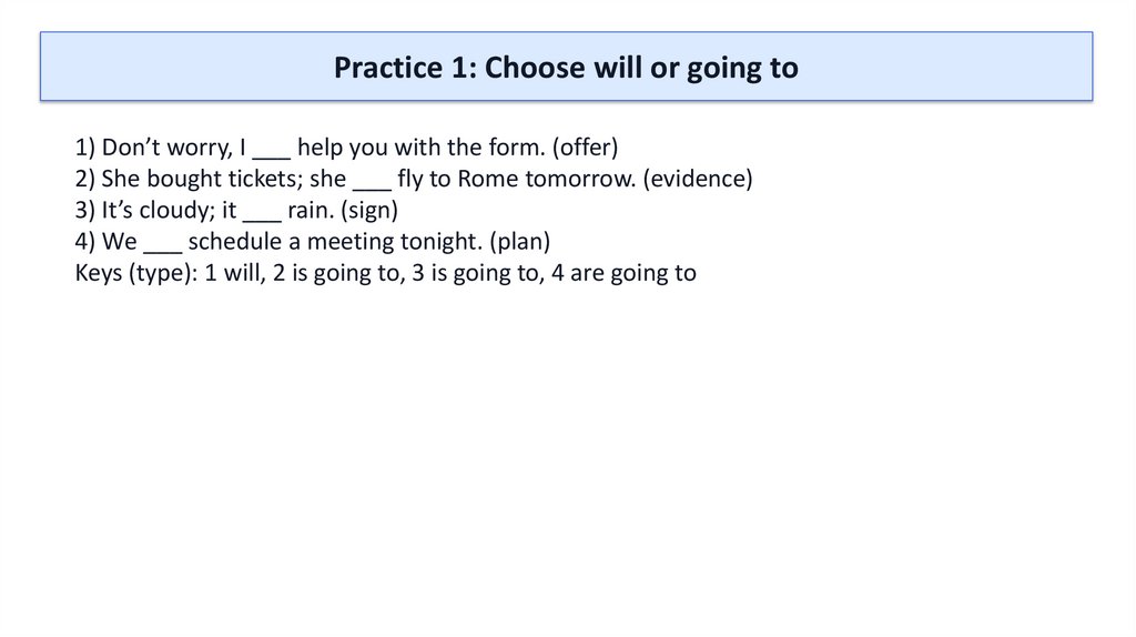 Practice 1: Choose will or going to1) Don’t worry, I ___ help you with the form. (offer)