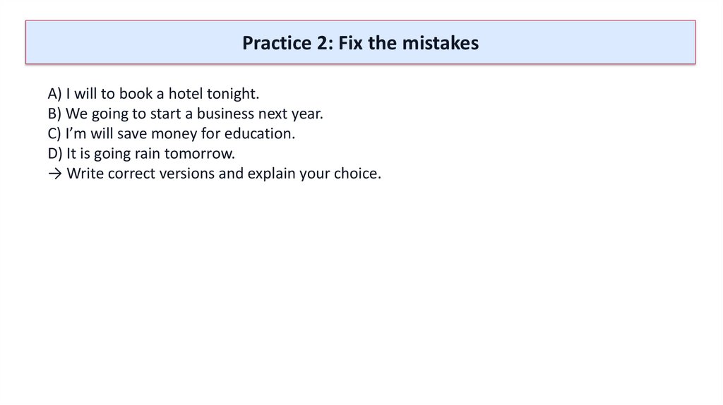 Practice 2: Fix the mistakesA) I will to book a hotel tonight.
