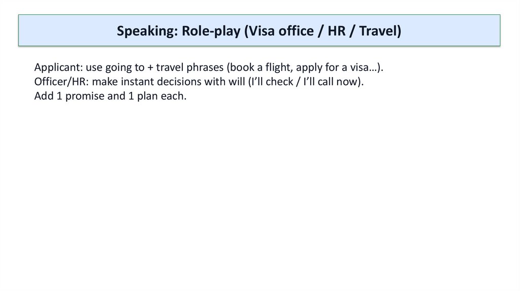 Speaking: Role-play (Visa office / HR / Travel)Applicant: use going to + travel phrases (book a flight, apply for a visa…).
