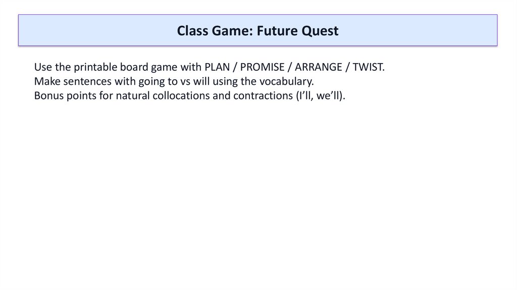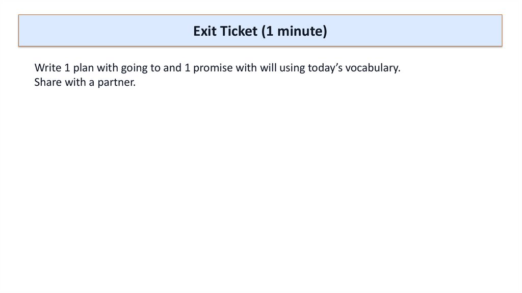 Exit Ticket (1 minute)Write 1 plan with going to and 1 promise with will using today’s vocabulary.