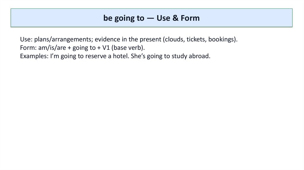 be going to — Use & FormUse: plans/arrangements; evidence in the present (clouds, tickets, bookings).