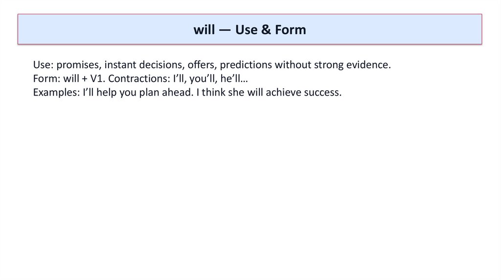 will — Use & FormUse: promises, instant decisions, offers, predictions without strong evidence.