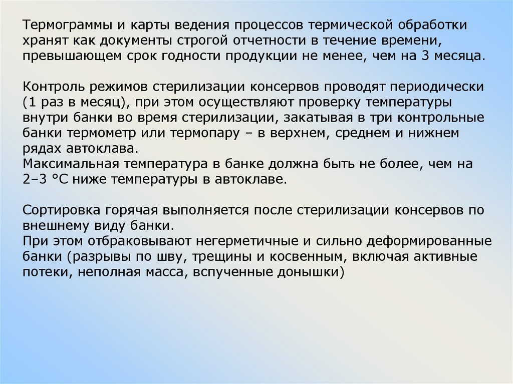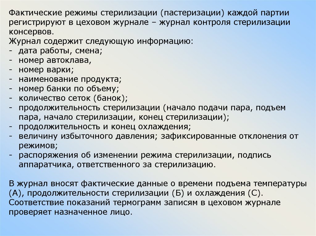 Фактические режимы стерилизации (пастеризации) каждой партиирегистрируют в цеховом журнале – журнал контроля стерилизации