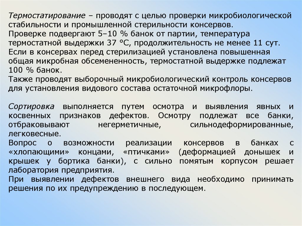 Термостатирование – проводят с целью проверки микробиологическойстабильности и промышленной стерильности консервов.