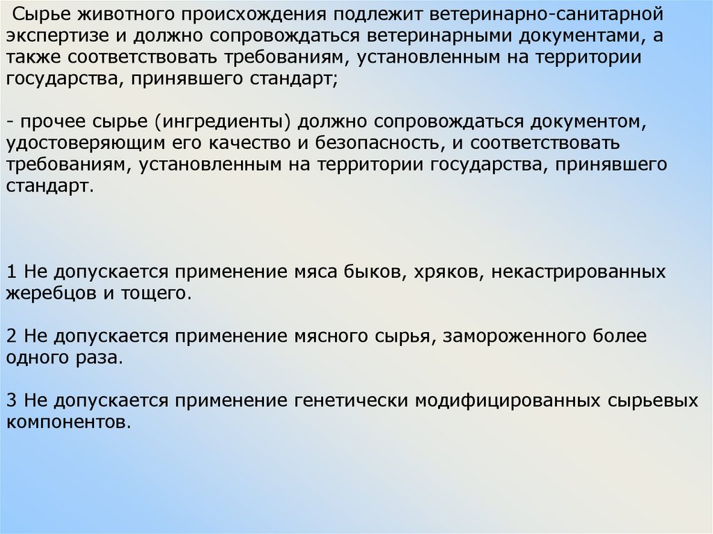 Сырье животного происхождения подлежит ветеринарно-санитарнойэкспертизе и должно сопровождаться ветеринарными документами, а