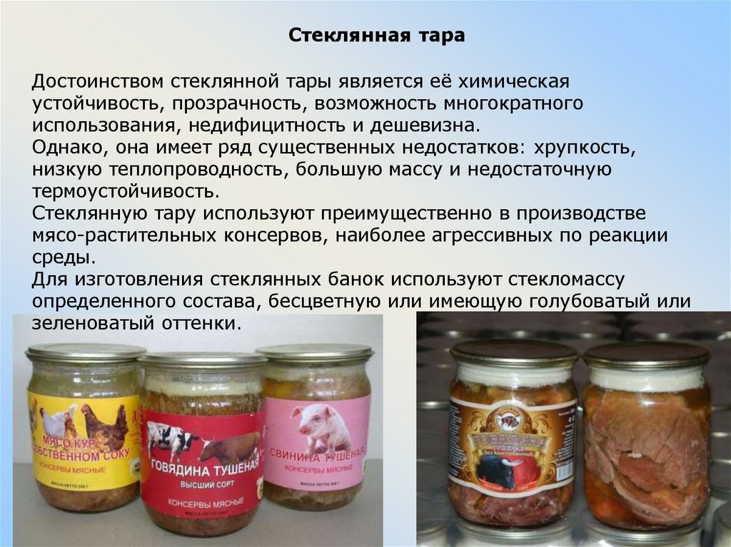 Требования к консервной таре: - герметичность; -прочность; высокая теплопроводность; -противокоррозионная устойчивость; химическая безвредность; - термостойкость; -небольшая масса; низкая стоимость; -привлекательный внешний вид; - возможность