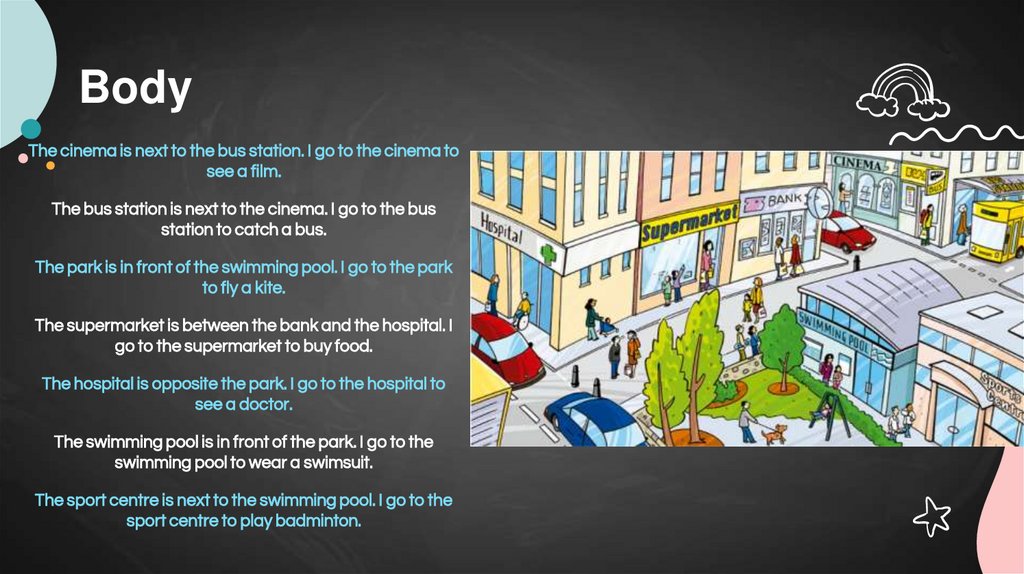 BodyThe cinema is next to the bus station. I go to the cinema to