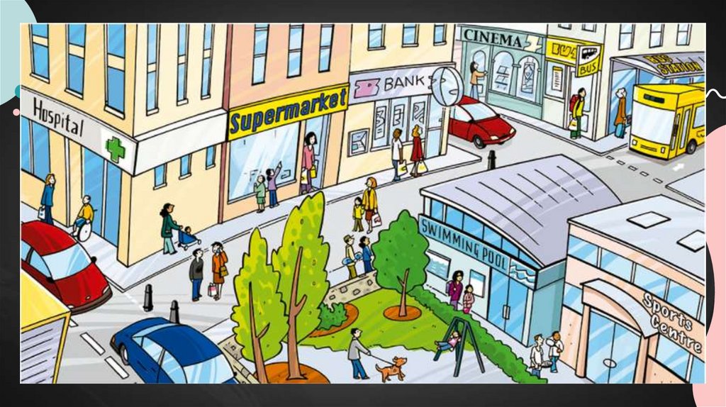 The supermarket is between the bank and the hospital. I