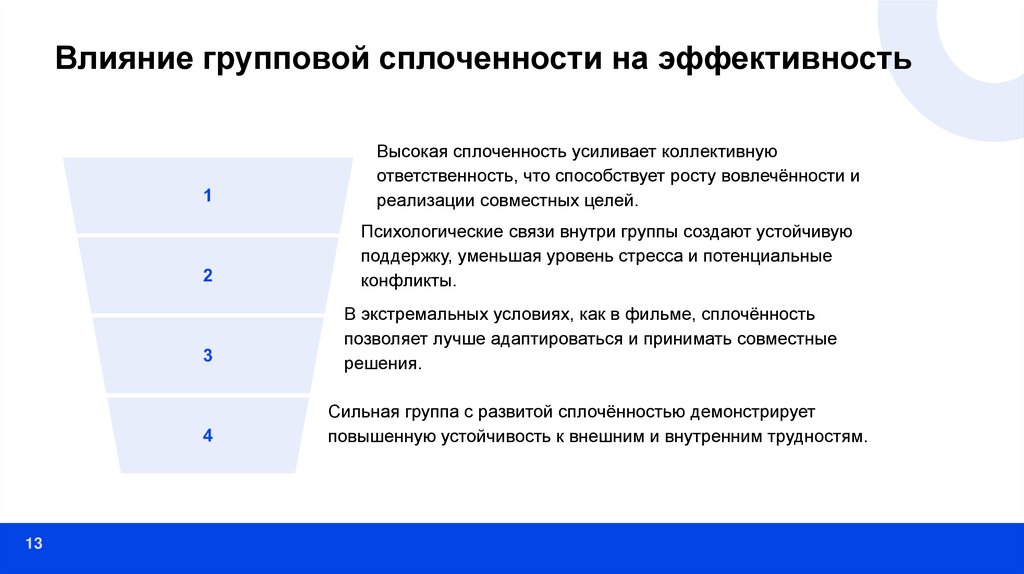 Влияние групповой сплоченности на эффективностьВысокая сплоченность усиливает коллективную