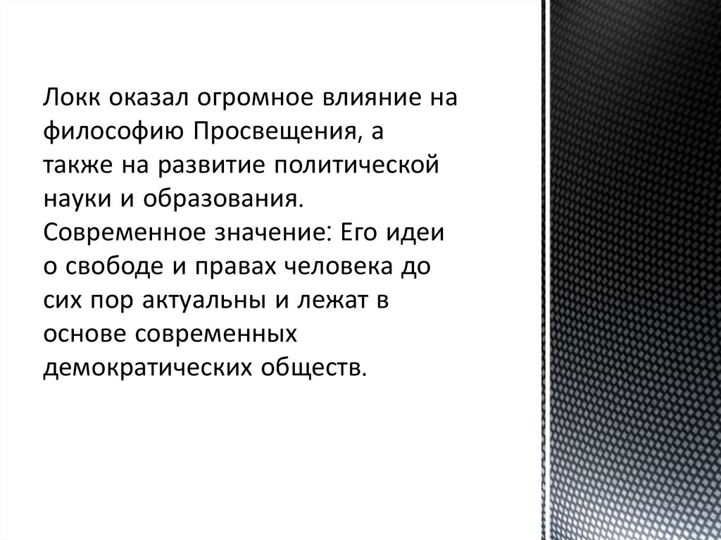Локк оказал огромное влияние нафилософию Просвещения, а