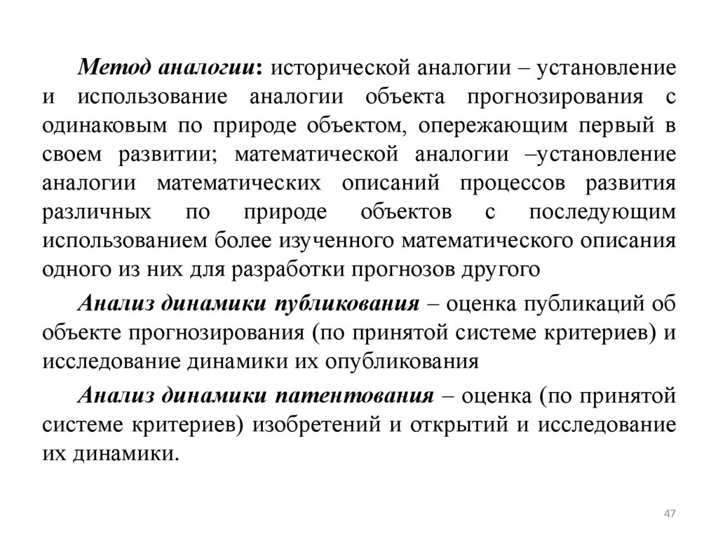 Метод аналогии: исторической аналогии – установлениеи использование аналогии объекта прогнозирования с