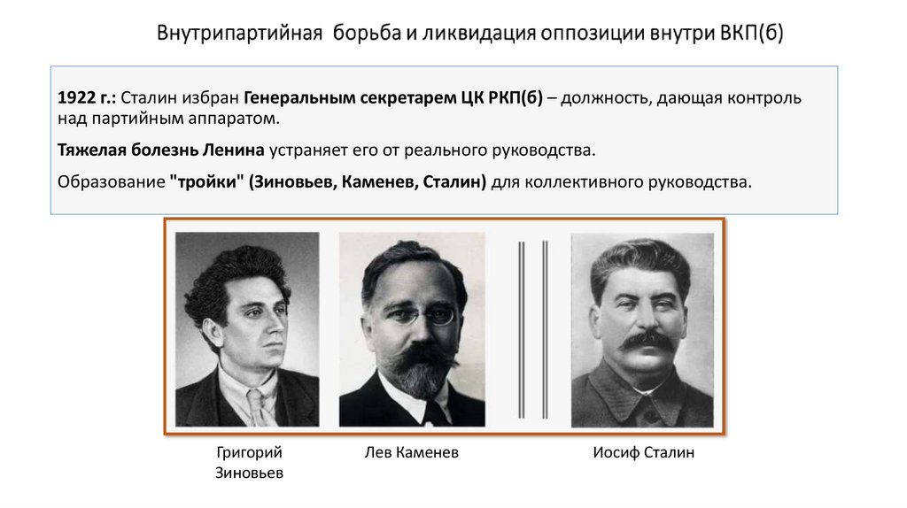 Образование "тройки" (Зиновьев, Каменев, Сталин) для коллективного руководства.