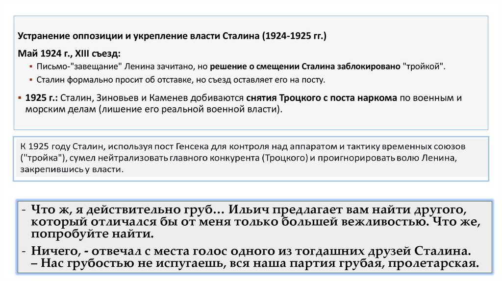 Устранение оппозиции и укрепление власти Сталина (1924-1925 гг.)Май 1924 г., XIII съезд: