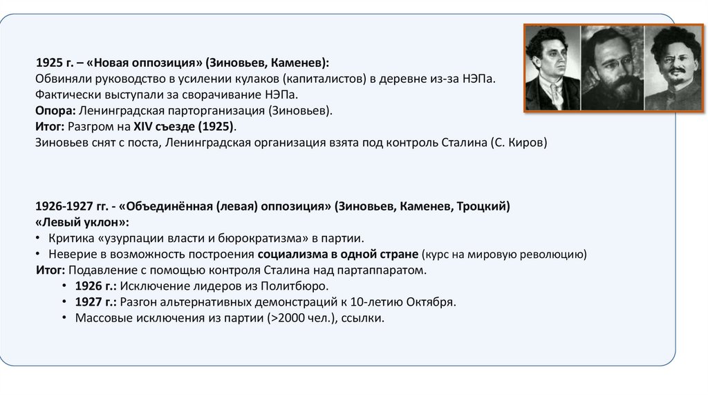1925 г. – «Новая оппозиция» (Зиновьев, Каменев):Обвиняли руководство в усилении кулаков (капиталистов) в деревне из-за НЭПа.