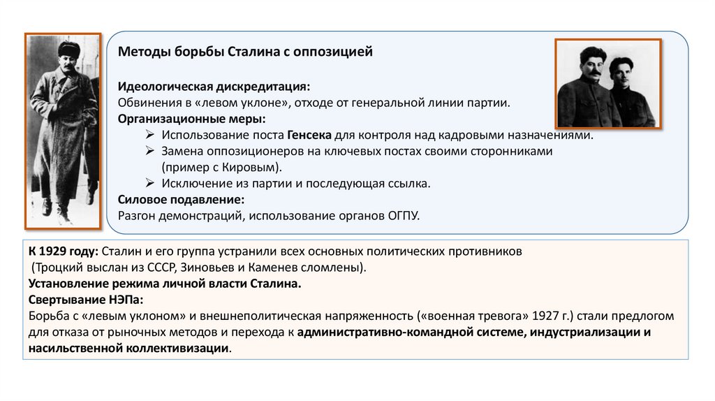 Методы борьбы Сталина с оппозициейИдеологическая дискредитация: