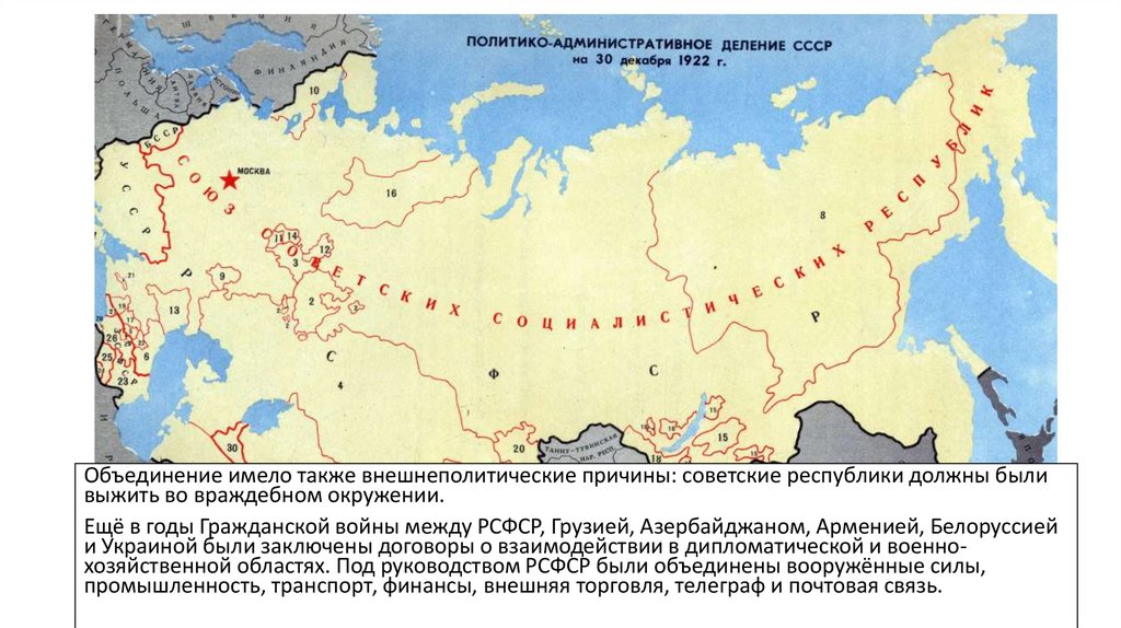 Объединение имело также внешнеполитические причины: советские республики должны быливыжить во враждебном окружении.