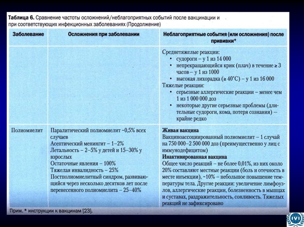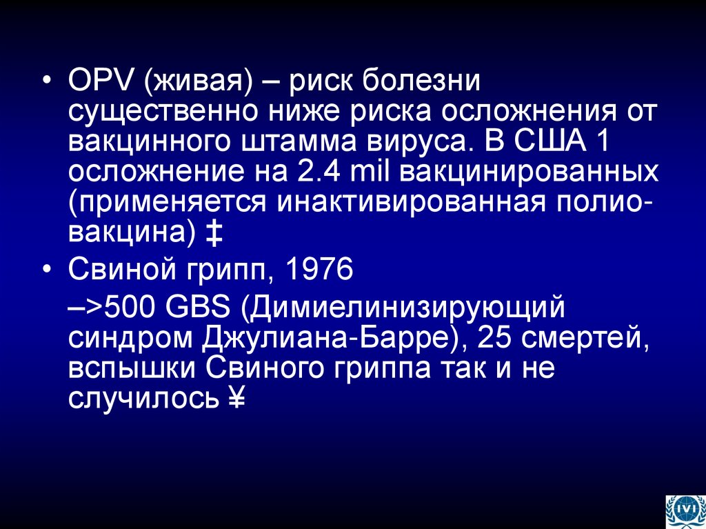 • OPV (живая) – риск болезнисущественно ниже риска осложнения от