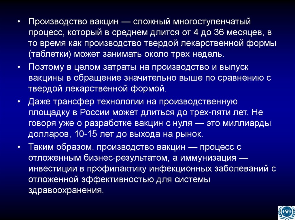 • Производство вакцин — сложный многоступенчатыйпроцесс, который в среднем длится от 4 до 36 месяцев, в