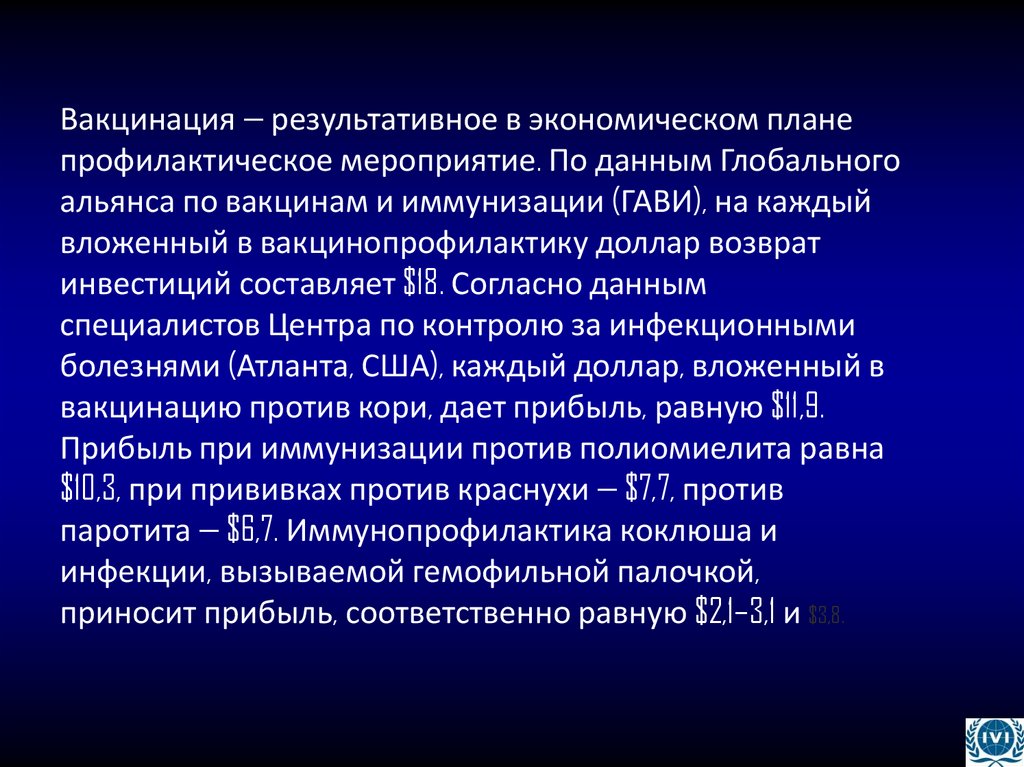 Вакцинация — результативное в экономическом планепрофилактическое мероприятие. По данным Глобального
