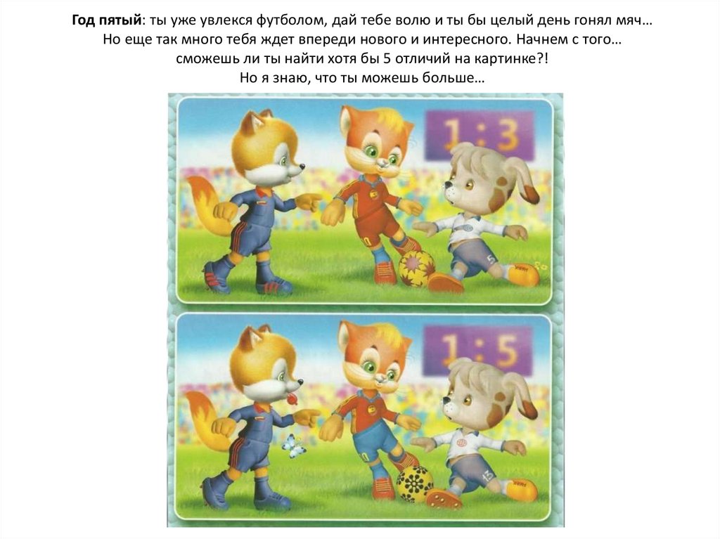 Год пятый: ты уже увлекся футболом, дай тебе волю и ты бы целый день гонял мяч…Но еще так много тебя ждет впереди нового и интересного. Начнем с того…