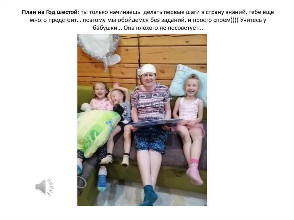 План на Год шестой: ты только начинаешь делать первые шаги в страну знаний, тебе ещемного предстоит… поэтому мы обойдемся без заданий, и просто споем)))) Учитесь у