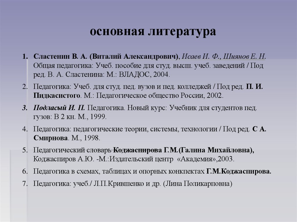 основная литература1. Сластенин В. А. (Виталий Александрович), Исаев И. Ф., Шиянов Е. Н.