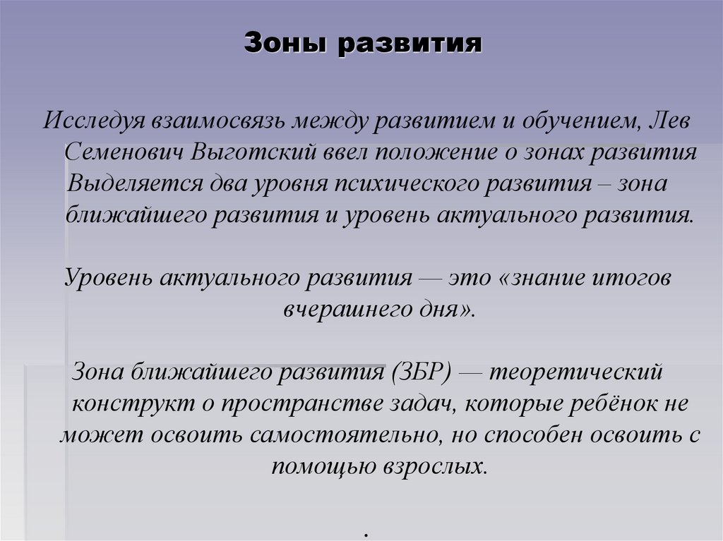 Зоны развитияИсследуя взаимосвязь между развитием и обучением, Лев