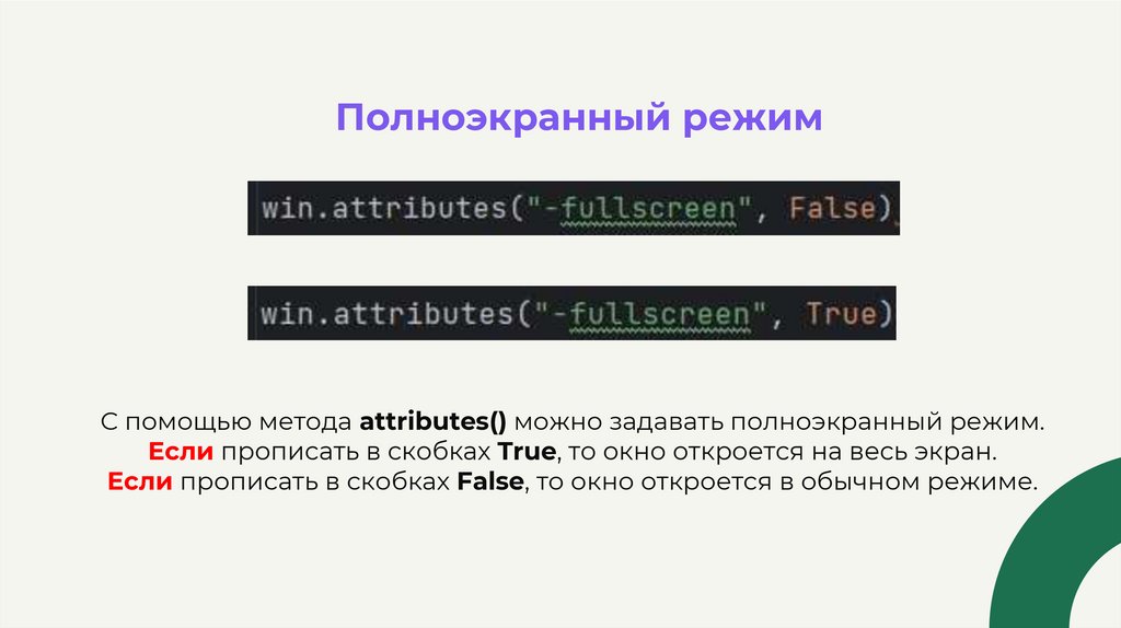 Полноэкранный режимС помощью метода attributes() можно задавать полноэкранный режим.