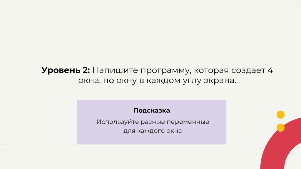 Уровень 2: Напишите программу, которая создает 4окна, по окну в каждом углу экрана.