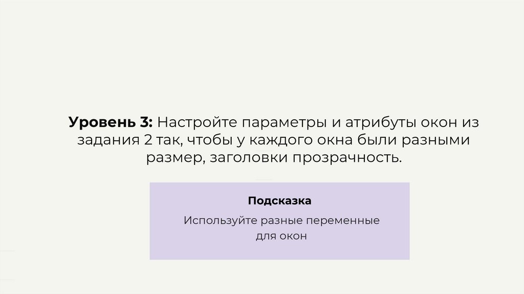Уровень 3: Настройте параметры и атрибуты окон иззадания 2 так, чтобы у каждого окна были разными