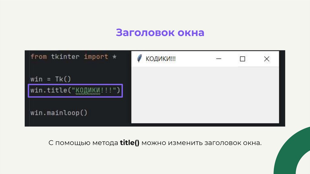 Заголовок окнаС помощью метода title() можно изменить заголовок окна.