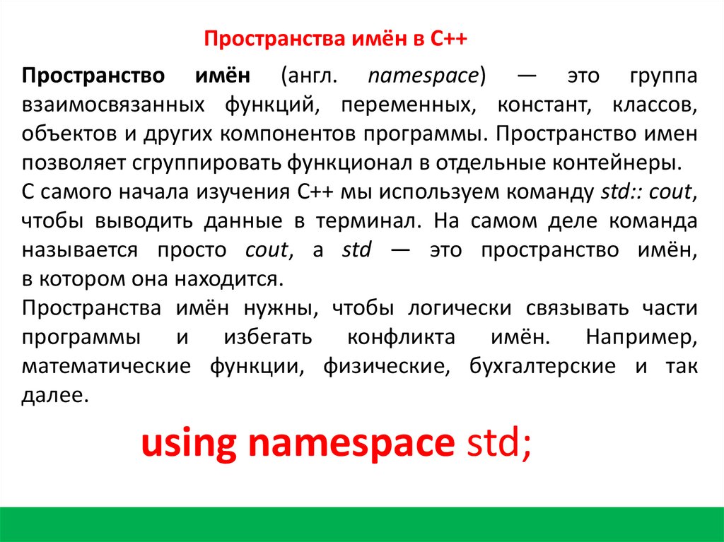 Пространства имён в C++Пространство имён (англ. namespace) — это группа