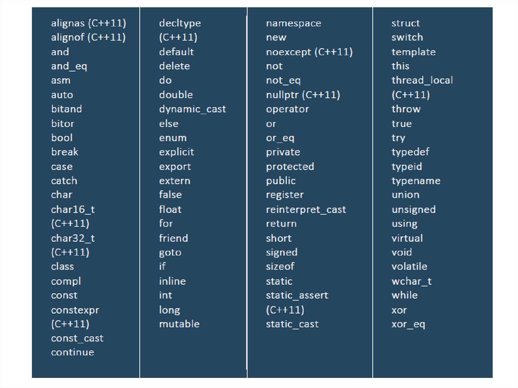 Язык C++ имеет зарезервированный набор из 84 слов (включая