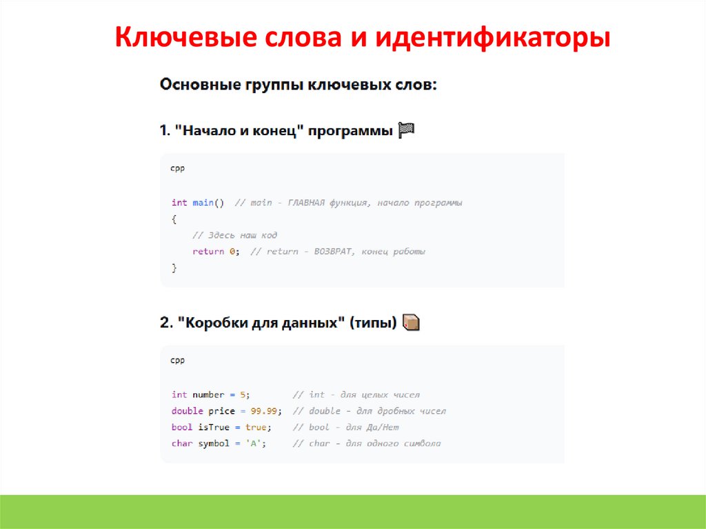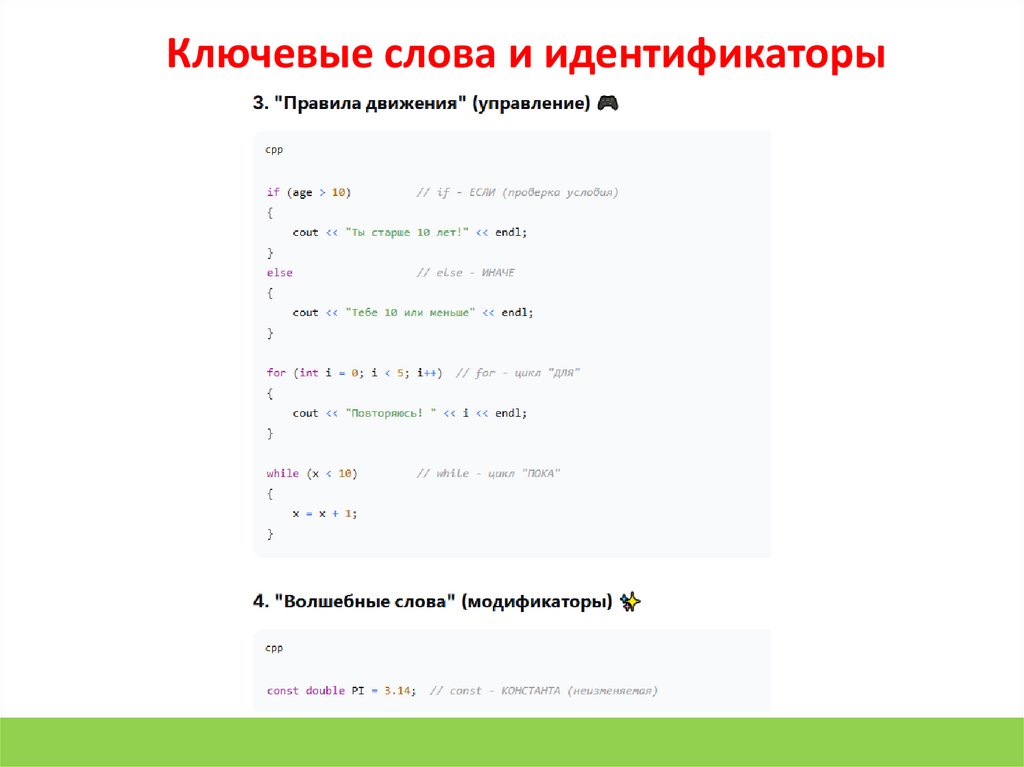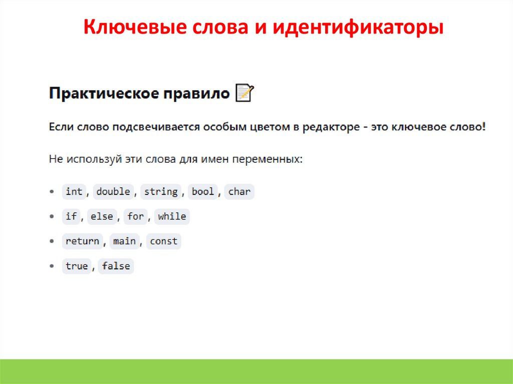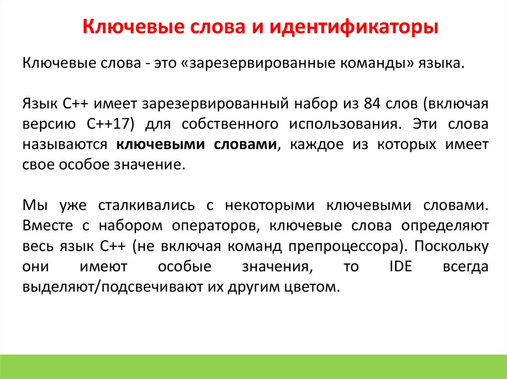 Ключевые слова и идентификаторыКлючевые слова - это «зарезервированные команды» языка.